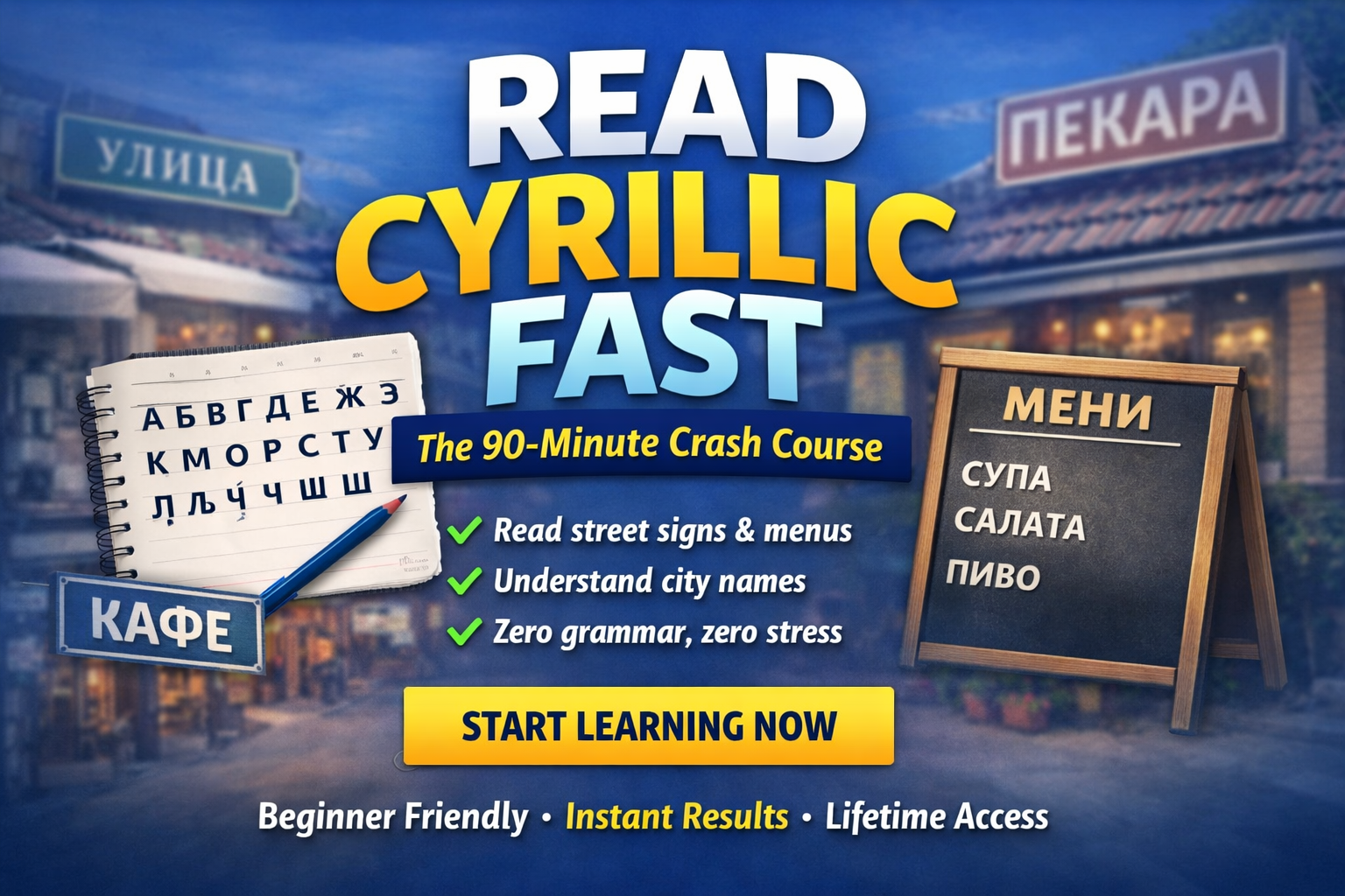 Previous Product From Zero to Reading Cyrillic in 90 Minutes 20,00 € From Zero to Reading Cyrillic in 90 Minutes quantity Add to cart Category: Self learning Reviews (0) Reviews There are no reviews yet. Be the first to review “From Zero to Reading Cyrillic in 90 Minutes” Cancel replyYour email address will not be published. Required fields are marked *Your rating * Rate… Perfect Good Average Not that bad Very poor Your review *Name * Email * Related products Self learningLevels 2 and 3 together 186,00 € Add to cart Quick View Quick View Self learningMontenegrin for Tourists 70,00 € Add to cart Quick View Quick View Self learningLearn to Speak Montenegrin Naturally – No Grammar Drills, Just Real Talk 45,00 € Add to cart